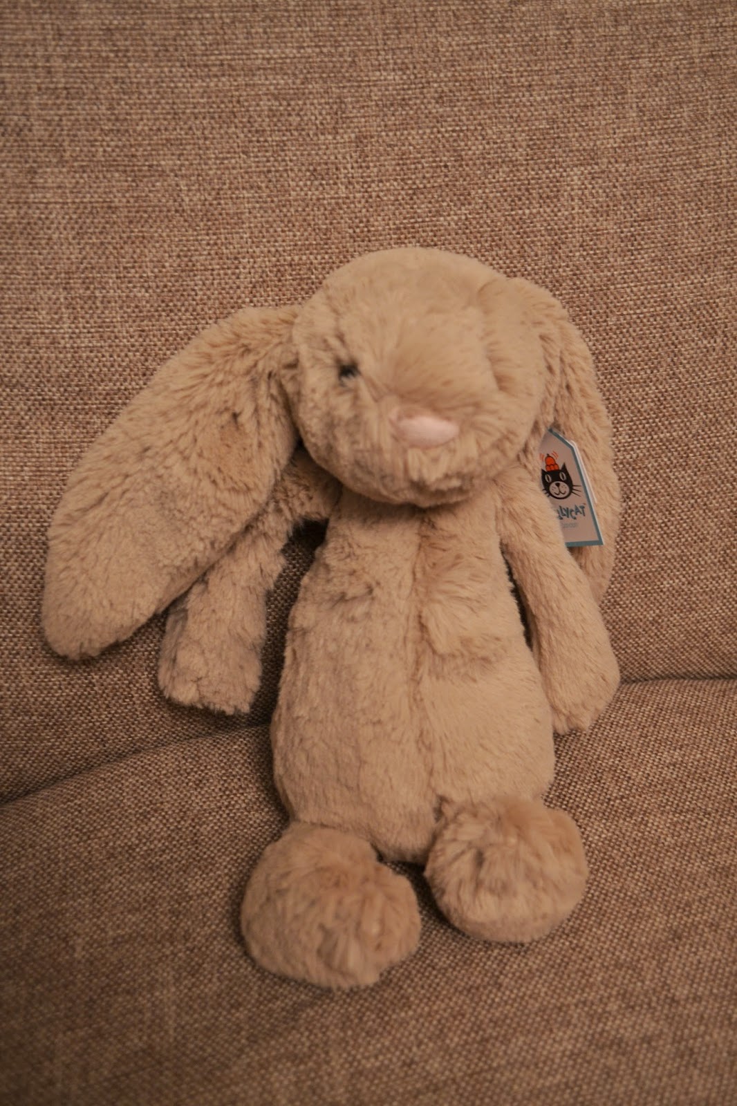 The bunny is so sweet. It's extremely soft and perfect for tiny hands to get hold of. The little man loves the feeling of the keys on his face, and seems quite keen to cuddle up with it. We actually bought him a bunny for when he was born, but it's nowhere near as nice as the one from Jellycat. When the bunny is not in use, it sits nicely on the little mans nursery shelf.