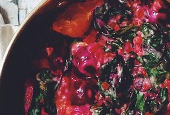 - Once onions have softened, add the reserved beets, beet greens, and cream sauce (don’t add it all at once, add it by the half cup until your desired creamy consistency is reached) and heat the beets and greens together for a minute to combine the flavors.