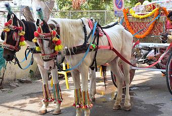 Horse drawn carriage – horses decorated.Those days on the day prior to marriage, there would be procession known as jhanvasam.