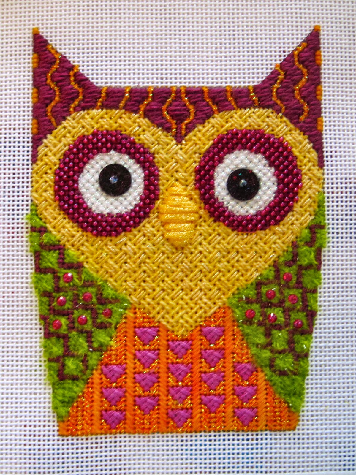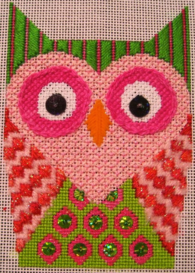 Judy G. has recently finished stitching all six of my Hoot Hoot! owls, using my stitch guides but her own stash threads, and they came out great, like all of Judy's stitching. I'm so happy to show the whole set off to you here today. Hopefully sometime soon I'll have more photos, when they come back from the finishers!