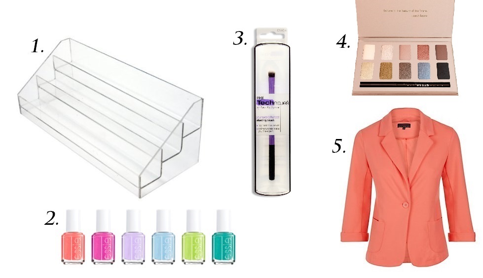 Real Techniques Eye Shading Brush | Stila In The Light Palette | New Look Peach Blazer1. My nail polish is slowly growing every month and I am running out of storage for them so whilst browsing amazon I came across this acrylic holder for the bargain price of £7.98. This will be great for my desk where I can keep my most used polishes as it holds up to 30 bottles of polish.2. I love Essie polishes! And over the past couple of months My Essie collection has grown rapidly and I can see it in the future growing even more! This is the 2013 summer collection and I love each and every color. Especially the Teal color and the pale lilac.3. A couple of posts ago I showed you the first ever Real Techniques brush that I have purchased and this is next on my list. I love eye brushes but only own a few so I am definitely in need of some more.4. I love me eyeshadows, especially neutral shadows and even better all in one palette. I have yet to own any Stila products so can see this being my first. I found it on Feel Unique for £25 which I think is an amazing price for a palette of 10 shadows plus an exclusive waterproof eyeliner.5. Coloured blazers are all the trend right now and I love all the colours available. Especially this coral/peach one from New Look for a great price of £19.99. Great for going out and for work so very versatile.