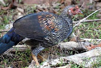 The gray junglefowl (Gallus sonneratii), also known as Sonnerat's junglefowl, is one of the wild ancestors of the domestic chicken together with the red junglefowl and other junglefowls. The species epithet commemorates the French explorer Pierre Sonnerat. Local names include Komri in Rajasthan, Geera kur or Parda komri in Gondi, Jangli Murghi in Hindi, Raan kombdi in Marathi, Kattu Kozhi in Tamil and Malayalam, Kaadu koli in Kannada and Tella adavi kodi in Telugu.