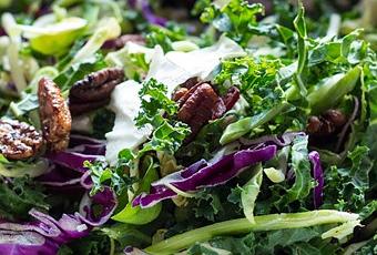 Kale Salad with Creamy Blue Cheese Dressing and Candied Pecans