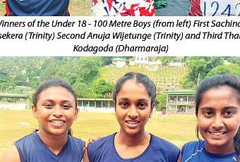 Winners of the Under 18 – 200 Metre Girls- First Seneeka Gunaratne C.I.S. (in the middle), Vidushini Thewanda Vihara Maha Devi,Second (on left) and Vidushinis’twin sister Kewmini Omanja Vihara Maha Devi, third (on right). Pictures by Upananda Jayasundera Kandy Sports Special Corr