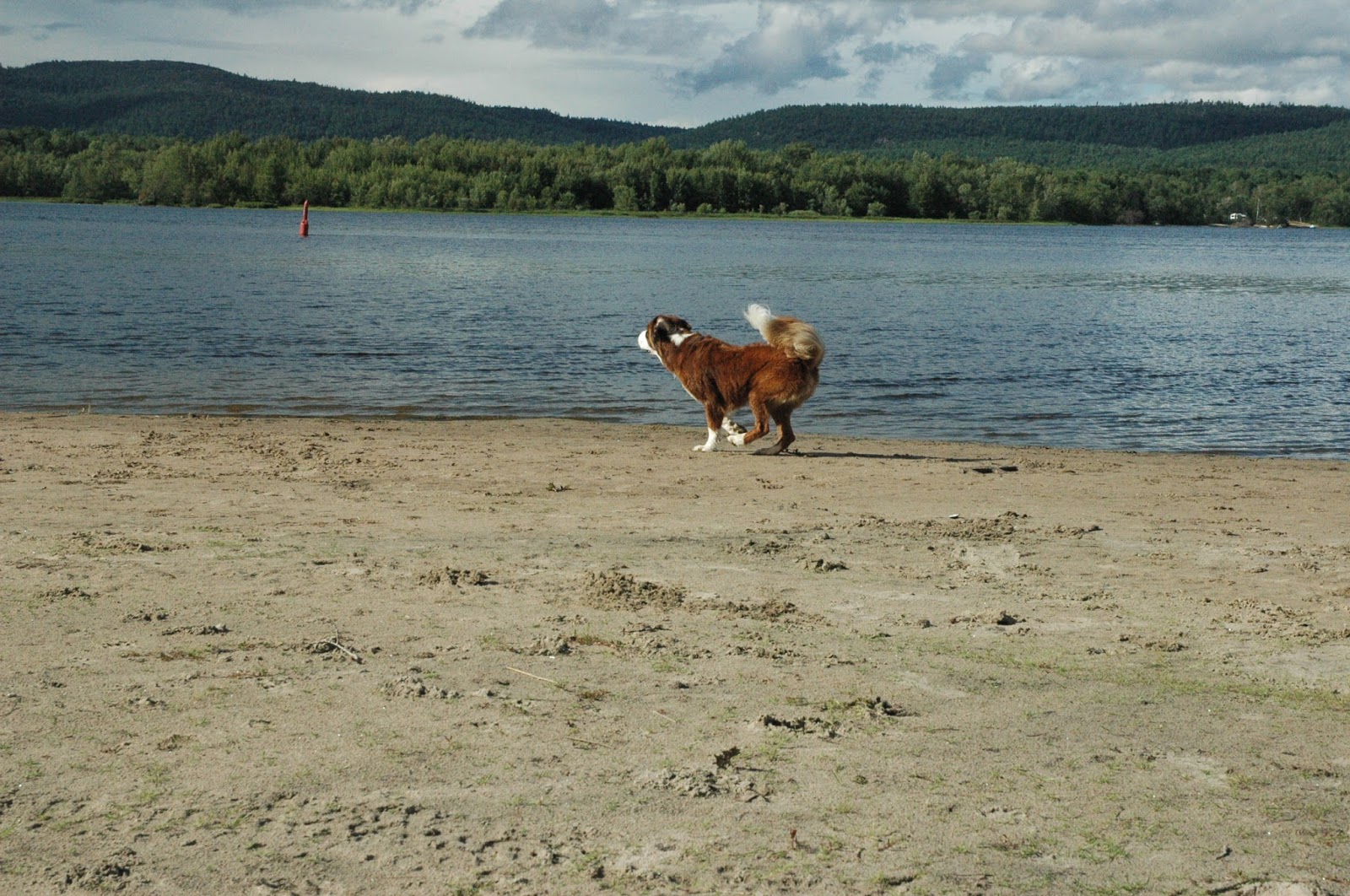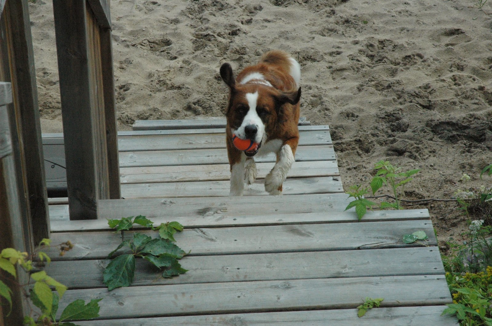 Chasing her ball in the water..