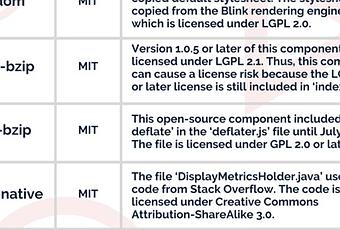 As mentioned previously, hidden vulnerabilities in Node.js are common. Various covert licenses can create tremendous problems for your business (both security- and legality-wise). As the table below shows, several free/open elements can cause significant issues.