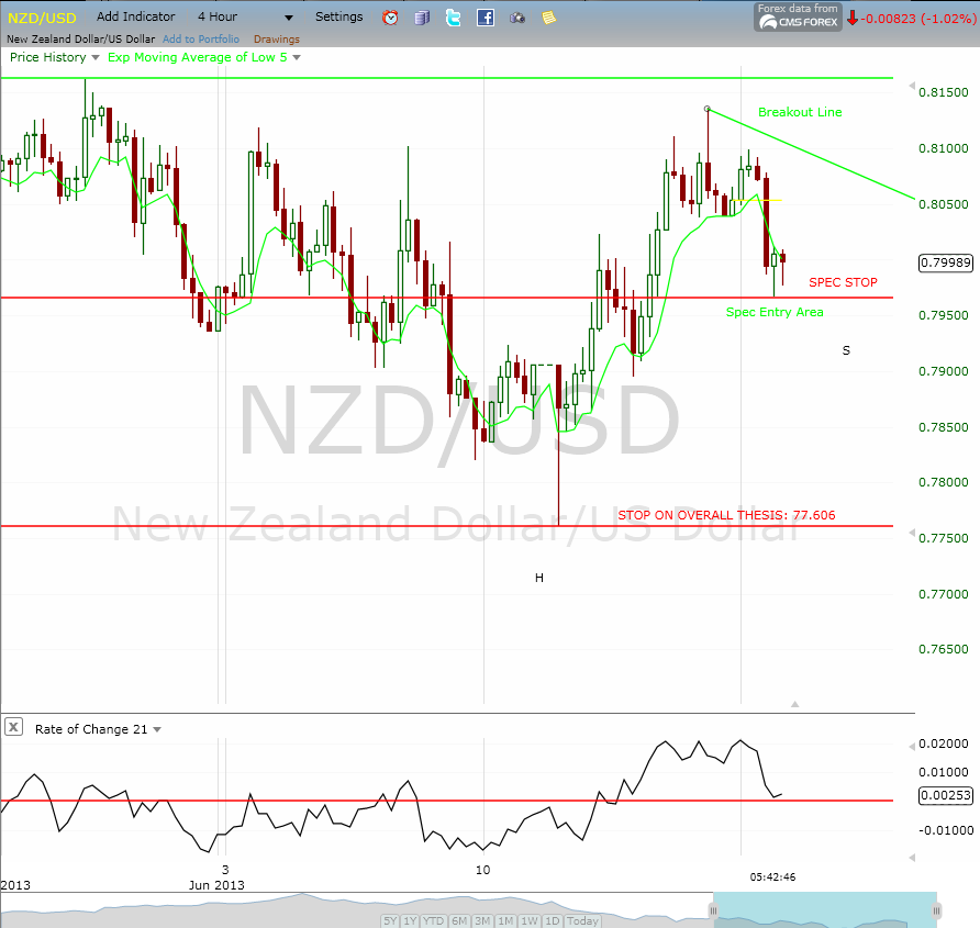 I have been tracking a potential bullish move in NZDUSD. As noted earlier today, we are in the speculative (i.e., not the confirmed breakout) entry area for me. See Today's Post. As indicated, this will likely be the next trade I track (after the USDJPY short trade) if we get the breakout back up. There are some things I do not like about this trade long term, but will let the chart lead me and stay present on it. I am going to try to front run this using the 4 hour chart. This is risky and could produce a stop out, but if it holds the stop will be really tight. Here is the chart: