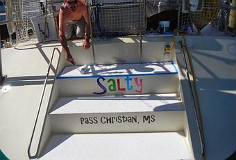 Step One: Dig into every hole in the boat to find all the pieces needed. Electric sander, sand paper, gallon of kiwi grip, roller, roller handle, masking tape, lacquer thinner, screw driver, trowel, cloth, garbage bag and sunny glasses because it’s bloody bright outside. On any given vessel these items will be found in 100 hundred different places and you’ll need to tear the boat apart.