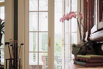 French doors are characterized by a lot of glass in the form of smaller panels called lites. They are also referred to as French windows because they were originally designed to be oversized windows offering access to balconies. Glass is fragile so muntins were put in place to add structural integrity. The overall structure is reinforced by mullions to further add strength to the door. French doors also typically come in pairs and are hinged, designed to either swing in or out.