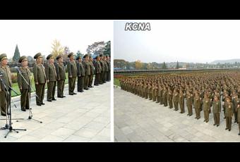 The Korean People’s Army [KPA] staged a loyalty rally at Ku’msusan Palace of the Sun in Pyongyang on 28 October (Monday) to “pay high tribute to President Kim Il Sung (Kim Il-so’ng) and leader Kim Jong Il (Kim Cho’ng-il) and thoroughly implement the important tasks set forth by Supreme Commander Kim Jong Un (Kim Cho’ng-u’n) in his historic speech made at the 4th meeting of company commanders and political instructors of the Korean People’s Army.” Attending the rally were KPA officers and service members, along with VMar Choe Ryong Hae (Director of the KPA General Political Department), Gen. Ri Yong Gil (Chief of the KPA General Staff), Gen. Jang Jong Nam (Minister of the People’s Armed Forces), Col. Gen. Kim Chang Sop (Director of the Ministry of State Security Political Bureau), senior KPA officials and KPA commanding officers.