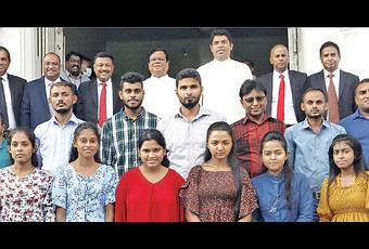 The first batch of the students following the diploma course at the Lake House Media Academy with Transport, Highways and Mass Media Minister Dr. Bandula Gunawardena, State Minister Shantha Bandara, Media Ministry Secretary and ANCL Chairman Anusha Palpita, DG of Government Information Department Dinith Chinthaka Karunarathne and Director (Operations) Manjula Makumbura, Prof. Harendra Kariyawasam, Director Finanace and the Editorial Director look on. Picture by Sulochana Gamage.