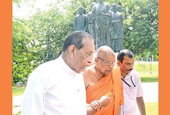 A ceremony to commemorate the 81st Birth Anniversary of late Ven. Maduluwawe Sobitha Thera took place yesterday at the memorial statue of Ven. Sobhitha Thera in Colombo. Here, former Speaker Karu Jayasuriya assisting a Buddhist Monk during the ceremony. Picture by Wasitha Patabendige