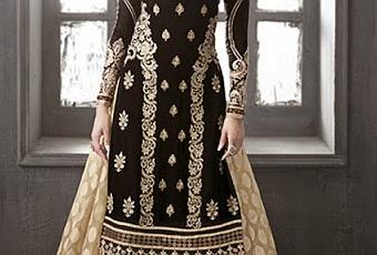 Anarkali suits are body fit till the breast and frilly and loose beyond that. They come in different lengths and most frequent ones are knee length and floor length. For bottom wear they are paired up with skin fit churidars along with contrasting or matching dupatta. The work on Anarkalis can be as heavy as required for weddings and as simple as that required for a birthday party.