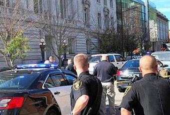 Local law enforcement officers secure an area in front of the Federal Buildng in Wheeling, WV, Wedneday, Oct. 9, after shooting outside the courthouse. The US Marshals Services says officers fired at the man after he shot up to two dozen rounds at the courthouse. Scott McCloskey/The Intelligencer/AP