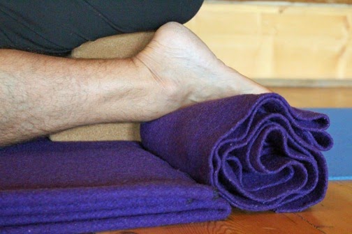 So today I’m going to make some suggestions for those individuals, and I suspect many of our readers fall into that category! First, make sure you have an adequate support under your sitting bones to elevate your entire body for sitting. Shari suggested a folded blanket or pillow on a chair seat to start to get the idea of your hips being slightly higher than your knees. For challenged yogis who are sitting in Seated Crossed Legs position (Sukasana), I suggest sitting on two to three folded blankets, on a block, or on the edge of a firm bolster.
