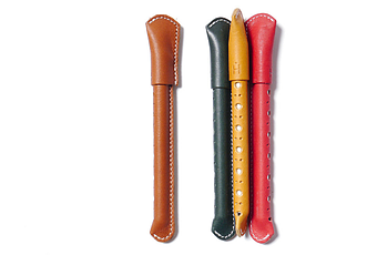 Hender Scheme a Japanese brand known for its line of gaudy pink leather shoes offered a matching set of pens. Each item comes with a leather perforated sleeve with removable top featuring a Hender Scheme stamp. These pens come in four sleeve color options including brown, forest, red, and tan. You can grab your set online for $28.