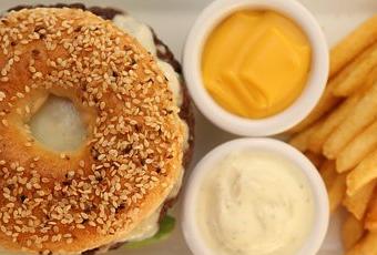 Imagine: A bagel, cut in half and filled with the best of ingredients. One layer on top of the other… expect to be amazed: “Bagel, cocktail sauce, onion ring, cocktail cheese melt, 220g Angus beef meat, sweet pickles, lollo verde lettuce, two tomato slices, Dijonaise sauce, bagel”. 10 layers perfectly set up to awaken all your senses.