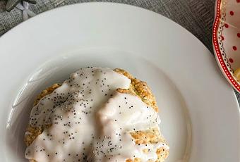 - Whisk the icing sugar, lemon juice and milk together to give you a thick spoon-able icing. Spoon this over the warm scones, sprinkling each one with some additional poppyseeds.