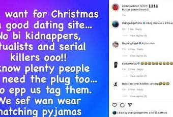 "All I want for Christmas is a good dating site..No bi kidnappers, ritualists and serial killers o.I know plenty people who need the plug too.Biko epp us tag them. We sef wan wear matching pyjamas".