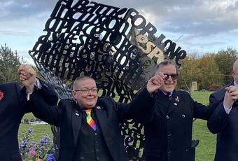 The memorial in bronze, at the National Memorial Arboretum in Staffordshire, takes the form of a crumpled letter featuring words from those affected by the ban, with the words ‘pride’ and ‘solidarity’ highlighted.