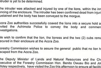 “Forestry Commission wishes to assure the general public that no lion has escaped from the Accra Zoo,” he added.