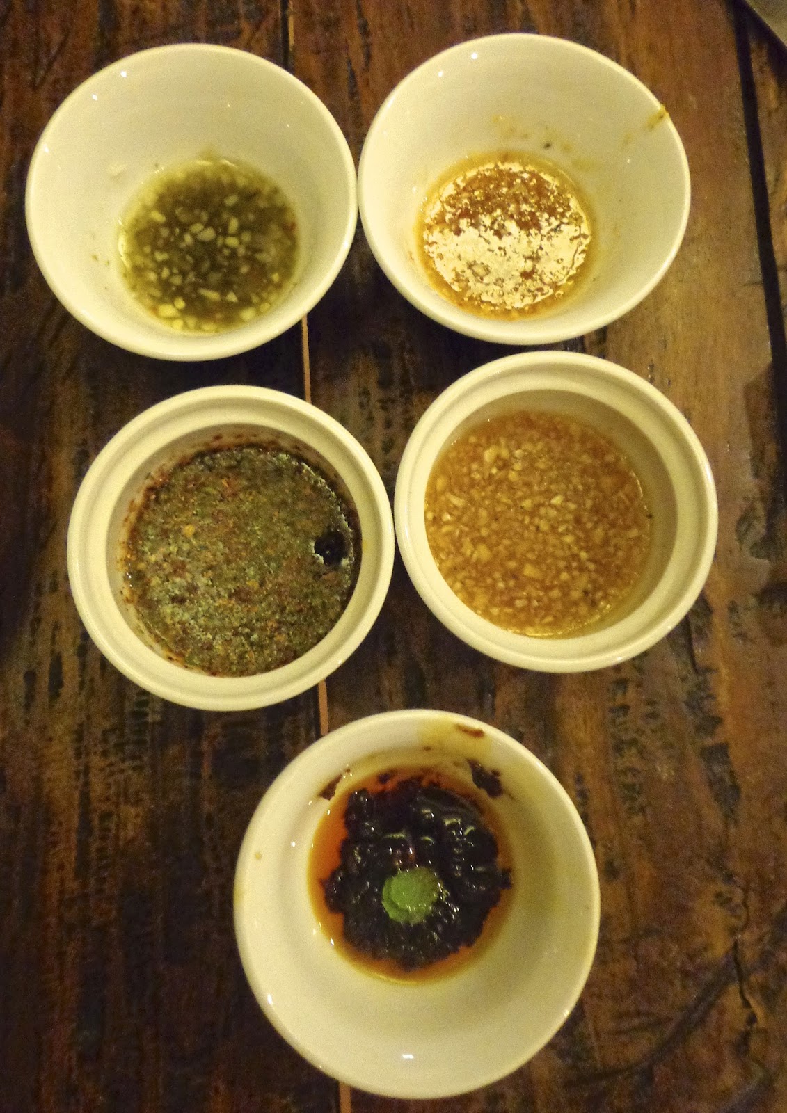 Here are the different sauces that came with our first three dishes. THe most interesting one for me was the tamarind sauce. It was sweet and tangy. But my favorite sauce is the subtly spicy sweet vinegar-based sauce for the Goi Con. All these sauces are made from scratch!