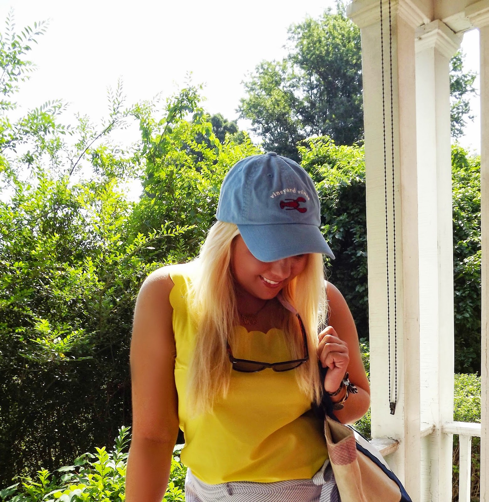 Outfit: Top- TJ Maxx, Skirt- Vineyard Vines, Hat- Vineyard Vines, Tote- Vineyard Vines, Sandals- Lilly Pulitzer, Bow Bracelet- Kiel James Patrick, Bangle- Bourbon and Boweties, Sunnies- via Etsy, Necklace- via Etsy, Sunglass Strap- Southern TideAnything I can pair a baseball cap with is perfect to me. The cap adds more of a casual look to an otherwise less lounge-like outfit. The scalloped top is one of my favorites because of the scallop detailing, but I can never figure out anything to pair it with because of the distinct color. I decided to pull it out and pair it with a seersucker skirt I picked up at Vineyard Vines a few years ago. It worked out better than I expected! The skirt is adorable because of the direction of the seersucker and the buttons and tie on the side of the skirt. All over, the outfit is an easy summer look. With the humidity increasing and the weather heating up, us Virginians are looking to wear are little of clothes as possible while still now suiting up in our "birthday suits" (yes I went there.) The humidity is not a fun thing to deal with which is white great lightweight tops paired with skirts are always a great alternative.
