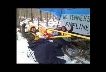MILFORD TOWNSHIP, Pa. – On Tuesday morning, two local youth blocked the Tennessee Gas Pipeline Northeast Upgrade construction by locking themselves through a Delaware State forest gate in Milford Township for the second consecutive day. Allison Petryk of Vernon, NJ and Alex Lotorto of Milford, PA plan to remain at the gate at the end of Schocopee Road throughout the work day again to prevent access by pipeline tree clearing crews.