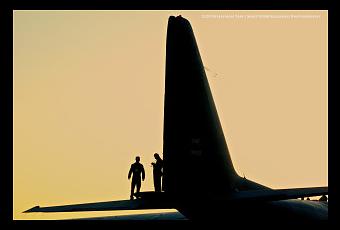 Two service members are silhouetted against the late afternoon sky after watching the Aviation Nation airshow from their unique perch. First flown in 1954, this iconic aircraft is in service all over the world with more than 2,500 produced to date. In 2017, the C-130 marked 60 years of continuous service with its original customer, the United States Air Force and also holds the record for longest production run of any military aircraft. Nikon D70s w/70-300mm.