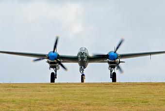 A Lockheed P-38F Lightning, White 33, taxis after performing at the 2017 Pikes Peak Regional Airshow. This is the most recent P-38 added to the short list of flyable survivors in the world. This aircraft was scrapped in New Guinea in 1944 after a nosewheel collapse, then buried in a pit after the war. Recovered in 1999, the wreckage ended up at Westpac Restoration in Colorado Springs where the most comprehensive P-38 restoration ever done was performed, and is one of only two flying P-38s with working turbochargers. This aircraft is restored to its original 475th Fighter Group wartime markings.