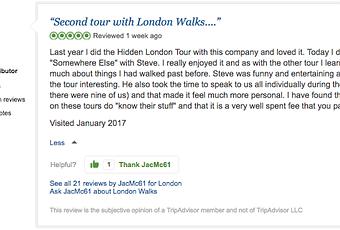 Mary, Fiona, Maxine & Noel in the London Walks office write… On Mondays & Fridays we'll be sharing reviews of our London Walks written by London Walkers. Firstly, THANKS to all who have written to us down through the years, your kind words are greatly appreciated! Our guides don't solicit these reviews on our tours – we believe that this would be a waste of your time. That's what makes these reviews all the more special – they have been sent to us by genuine London Walkers who have given up their valuable time to drop us a line or two, or leave a comment on travel message boards & websites. Thanks everyone.