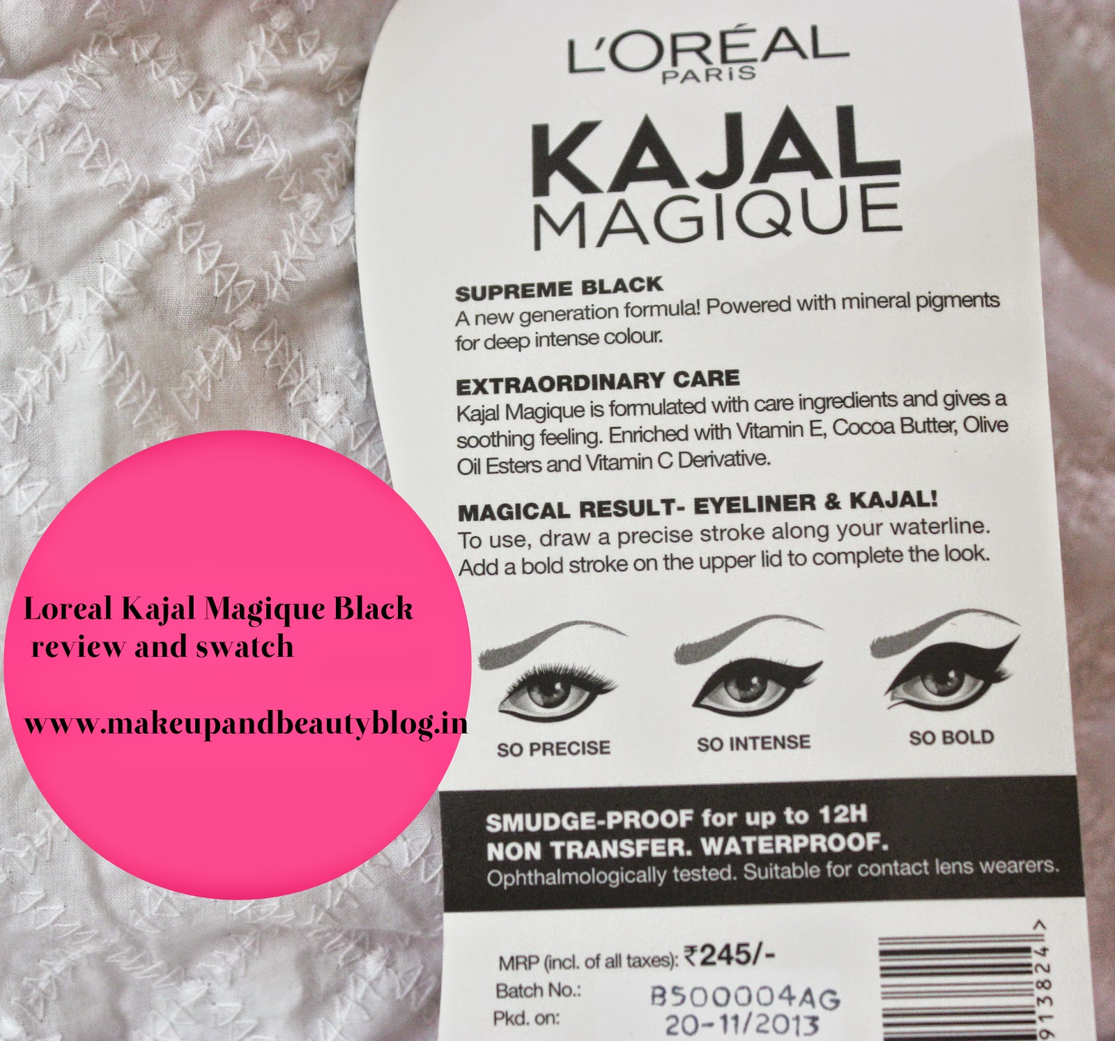 What L’Oreal Kajal Magique Black claims? Precise, intense and bold create the blackest black line with the L’Oreal Paris Kajal Magique that defines your gorgeous eyes and gives you smudge-proof, water-proof all-day wear.DETAILS· L'Oreal Paris Kajal Magique is powered with a new generation formula and mineral pigments for a deep intense color payoff· Along with providing a great finish, it is also enriched with ingredients like Vitamin E, Cocoa Butter, Olive Oil Esters and Vitamin C Derivative, which provide extraordinary care and a soothing feeling to the eyes· Supremely Black and Doubles up as a Darker-than-night Eyeliner: The innovative formula and mineral pigments give you an intense and rich black color payoff that looks dramatic· Provides Great Finish: The creamy Kajal Magique goes smoothly when applied and doesn’t budge after drying to give you a great finish· What’s more, it’s enriched with nourishing Vitamin E, cocoa butter and olive oil esters that provide care· Lasts for upto 12 hours: The waterproof formula doesn’t budge and stays intact from 9 a· m to 9 p· m – that’s through your entire work day· Ophthalmologically Tested: The formula is tested and found gentle enough to be used by contact lens wearers
