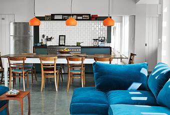 In the farmhouse architect Lucy Marston built for her family in Suffolk, England, she balanced off-the-shelf pieces, such as a velvet-covered sofa from sofa.com, with customized key elements, like the kitchen. The refrigerator is from Fisher & Paykel, and the tiles are from Topps Tiles.
