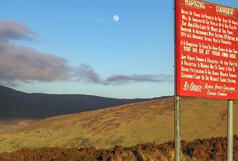 This route crosses the army firing range at the Glen of Imaal. If you see flashing lights or red flags up around the perimeter or at the start, do not access the area as there is scheduled firing. Do plan ahead by checking the Irish Defence Forces website for the schedule, www.military.ie/en/public-information/glen-of-imaal-walking-route-closures/ You can also call the Army Information range at the Glen of Imaal on 045-404653. Do not deviate from the approved path as there may be unexploded shells and projectiles on the ground, sometimes buried or obscured by rocks or vegetation.