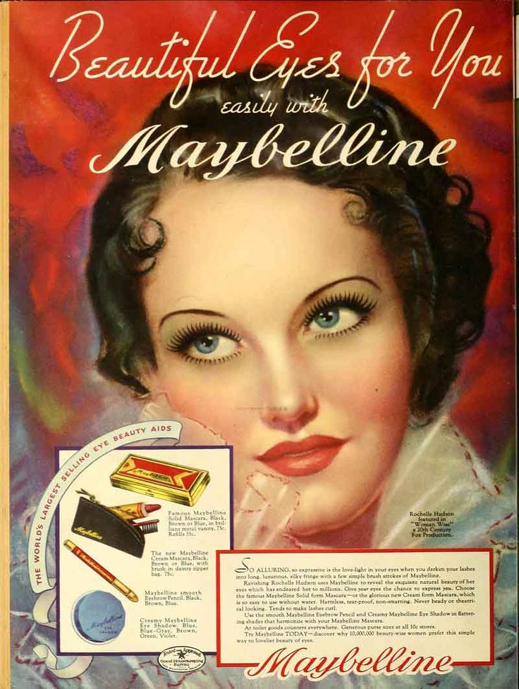 Mabel mixed ash from cork she burned, with coal dust, and blended this mixture by using petroleum jelly. She dabbed this goo onto her eyebrows and the tips of her eyelashes. The transformation was amazing. Mabel's eyes were stunning. Then, an idea struck Tom Lyle like a bolt of lightening. Of course, it wasn't the clothes or smiles that made Hollywood goddesses glamorous. It was their "eyes." Mascara was born. The name Maybelline came from Mabel and the Vaseline mixture.