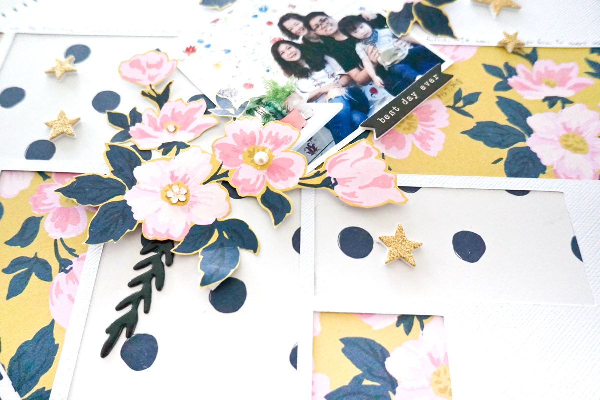 Once that is done, I adhered the photo & worked around it by adding foam stickers & fussy cutting floral. I wanted to keep the layout simple but yet pretty. gave some textures and depth to the layout! Finally, I completed my layout with a little journaling along the diagonal line.
