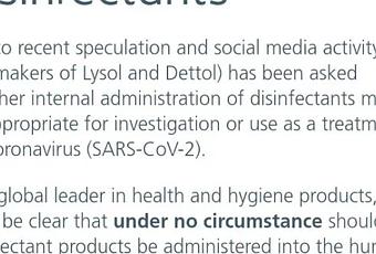 The statement from RB reads: “Due to recent speculation and social media activity, RB (the makers of Lysol and Dettol) has been asked whether internal administration of disinfectants may be appropriate for investigation or use as a treatment for coronavirus (SARS-CoV-2).