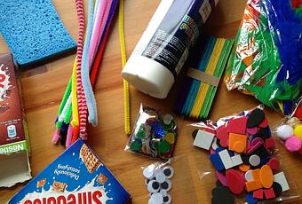 First of all, we went for a butterfly, we used a bit of cereal box for the body and added some lolly sticks onto that to give it a bit more color and strength. Sienna then added some googly eyes, pipe cleaners and we used some bright feathers as the wings.