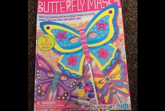 It’s a very simple kit, no complex parts or anything like that. In fact it’s so simple to do the instructions aren’t really needed. It comes packed in a cardboard sleeve and quite simply contains 3 cardboard pre printed butterfly masks, mask sticks/holders and a pack containing paints, glitter and sticky tape.