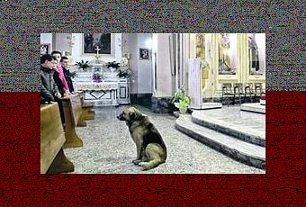 Ciccio, a 12-year-old German shepherd, waits in vain in front of the altar of the Santa Maria Assunta