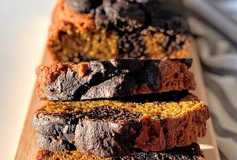 The squash variety and its cooking method will impact the water content of the purée and in turn the bake time. Insert a cake tester or knife all the way into the bottom of the loaf after 75 minutes, and if it comes out with wet batter then the loaf is undercooked and needs more time in the oven. Keep in mind that your loaf may take longer to bake, and loosely tent the pan with aluminum foil if the top begins to over brown before the center or bottom are cooked through. The Marbled Japanese Pumpkin Bread is ready once the cake tester or knife comes out clean or with only a few moist crumbs.