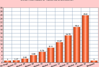 The results of their study are shown in the chart above. Note that even small amounts of alcohol usage will heighten the danger of a crash with alcohol. Even legal amounts can drive the rich up. The base for the study is 1.00 (the risk posed by non-users of any drug). A person with a .03 blood alcohol content has slightly elevated risk of 1.17, while a person with .05 (within the legal limit) has a risk of 2.05 (double the risk of non-users), and the risk continues to rise as the amount of alcohol used rises.