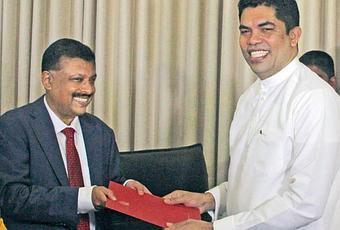 Newly appointed State Minister of Mass Media Shantha Bandara assumed duties at his office in the Postal Headquarters, D.R.Wijewardene Mawatha, Colombo 10 yesterday. Here he hands over the relevant documents after signing them to the Secretary to the Ministry of Mass Media and Chairman of Associated Newspapers of Ceylon (Lake House) Anusha Palpita. Picture by Kelum Liyanage