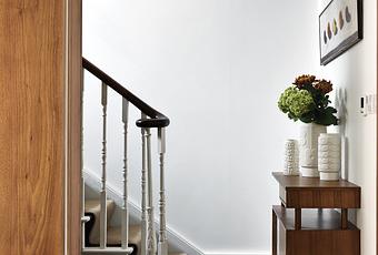 In the ground-floor eating area, the design team wrapped the walls in rich walnut to instill warmth often found in mid-century homes. “Sometimes one bold move is enough. Be brave with fewer statements,” Kiely advises. “Go for the big thing rather than lots of little things.” Kiely’s Upholstered Dining Chairs from her House collection surround a Danish vintage dining table. Her Gloss vases adorn the hallway console, which is also from her House line. Photo by Chris Tubbs.