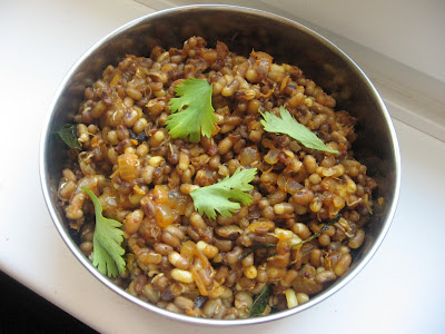 My Husband's favourite curry in maharashtrian food is "matkichi usal".After my marriage,I hardly know ABC's of cooking,one day he went to kitchen and cooked 'matkichi usal' for me and same time teach me also.Matki means sprouted beans and it is also called as math or matki in marathi.Matki usal is very famous Maharashtrian traditional cuisine , its lentil curry made with onion,tomato and other spices.'Matki Usal' is very good recipe for protein content as well as gluten free diet.