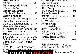 Kusal Mendis and Dhanajaya de Silva tried to repair the innings for the third wicket but David Warner took a one handed catch at mid on to dismiss Dhananjaya de Silva at the 26th over and de Silva was out for 7 runs.