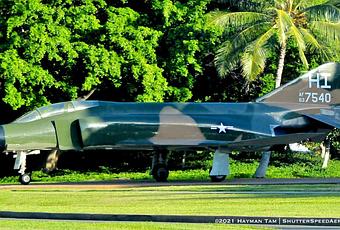 While leaving the base after the 2009 Hickam AFB Open House Airshow, we saw this Phantom gate guard in the colors of the 199th Fighter Interceptor Squadron, Hawaii ANG. In October 1976 the 199th FIS traded in their F-102 Delta Daggers for the F-4C Phantom II. The Hawaii ANG used the Phantom in fighter-bomber and interceptor roles during training exercises, as well as retaining the standing air defense alert at Hickam. Designed by McDonnell Aircraft and first flown in 1958, this classic fighter served with all three US services and air forces around the world. December 21, 2016 would mark the phinal retirement of the Phantom from US service. F-4 production ran from 1958 to 1981, with a total of 5,195 built, making it the most produced American supersonic military aircraft. McDonnell Aircraft would later merge with Douglas Aircraft in 1967. Nikon D300 w/70-300mm.