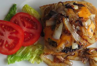 What you have here is a parmesan toasted slice of buttery sour dough bread, topped with an all-beef patty, which has been topped with Pub Cheese and sauteed onions. The burger is briefly covered after you add the cheese and onions to the top so that the cheese can melt.