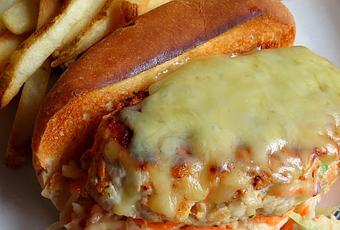 Ground turkey is mixed with minced jalapenos, grated carrot, onion, garlic and green Tabasco sauce. So, a bit spicy. Shaped into patties and grilled with a slice of Jack cheese melted on top at the end, they are served tucked into toasted buns with a cool and creamy homemade ranch dressed coleslaw tucked in with the burger.