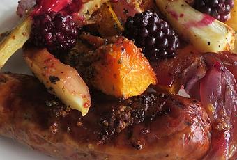What you have here are thick and meaty sausages roasted on a baking sheet with butternut squash, parsnips, red onions and some fresh blackberries. There is a glaze of grainy mustard and maple syrup added to the sausages and veggies near the end just prior to the blackberries being added. The blackberries cook only briefly so that they hold their shape.
